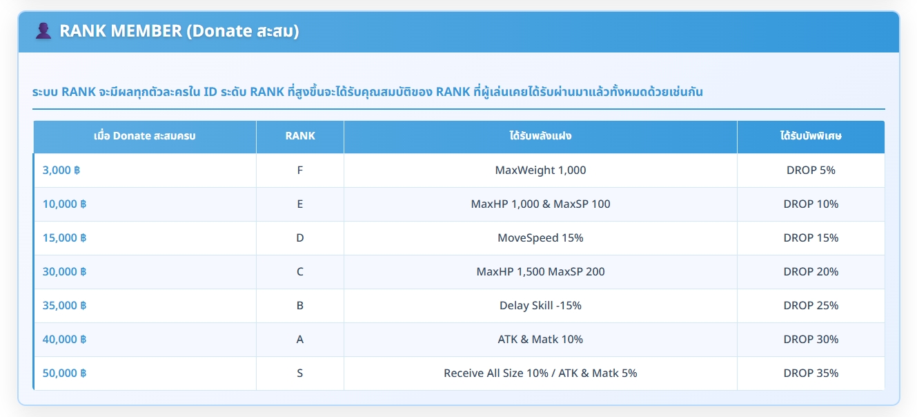 เพียงสมาชิกทำการ Donate เข้ามาในระบบเซิร์ฟเวอร์ ก็จะได้รับ ยอดสะสม Rank Member