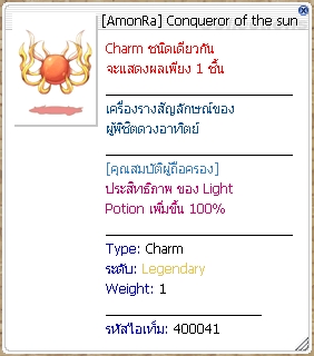 - [AmonRa] Conqueror of the sun คุณสมบัติ - ประสิทธิภาพ ของ Light Potion เพิ่มขึ้น 100%