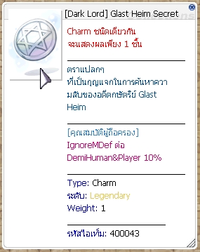- [Dark Lord] Secret of Glast Heim คุณสมบัติ - Ignore MDef ต่อประเภท DemiHuman & ผู้เล่น 10%