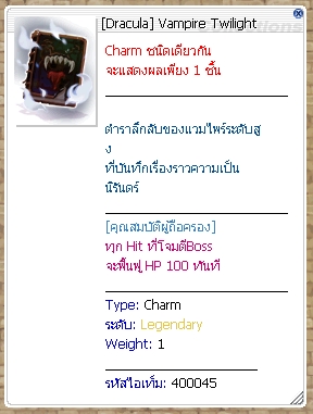 - [Dracula] Vampire Twilight คุณสมบัติ - ทุก Hit การโจมตีบอส จะฟื้นฟู HP 100 ทันที