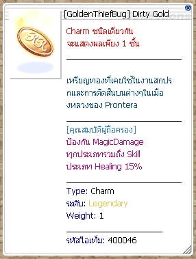 - [GoldenThiefBug] Drity Gold คุณสมบัติ - ป้องกัน Magic Damage ทุกประเภทรวมถึง Skill ประเภท Healing 15%