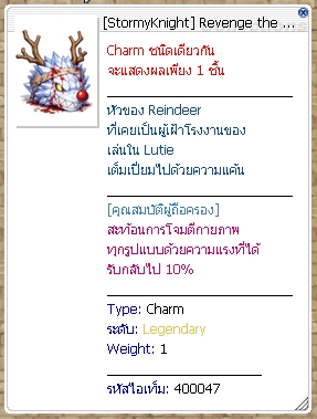 - [StormyKnight] Revenge the Reindeer คุณสมบัติ - สะท้อนการโจมตีกายภาพทุกรูปแบบ ด้วยความแรงที่ได้ รับกลับไป 10%