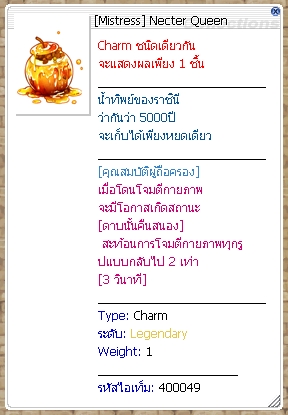 - [Mistress] Necter Queen คุณสมบัติ - เมื่อโดนโจมตีกายภาพ จะมีโอกาสเกิดสถานะ [ดาบนั้นคืนสนอง] สะท้อนการโจมตีกายภาพทุกรูปแบบกลับไป 2 เท่า [3 วินาที]