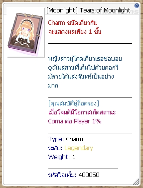 - [Moonlight] Tears of Moonlight คุณสมบัติ - เมื่อโจมตี มีโอกาสเกิดสถานะ Coma ต่อผู้เล่น 1%
