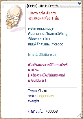 - [Osiris] Life is Death คุณสมบัติ - เมื่อตัวละครตุย มีโอกาส ฟื้นคืนชีพ 40% [ไม่แสดงผลใน Guildwar]