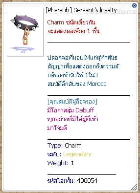 - [Pharaoh] Servant's loyalty คุณสมบัติ - มีโอกาสสุ่ม Debuff ทุกอย่างที่มี ใส่ผู้ที่เข้ามาโจมตี