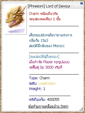 - [Phreeoni] Lord of Devour คุณสมบัติ - เมื่อกำจัด ผู้เล่น ทุกรูปแบบ จะฟื้นฟู SP 3,000 ทันที