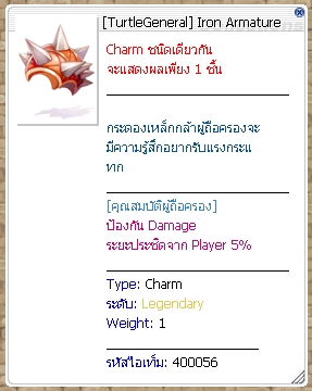 - [TurtleGeneral] Iron Armature คุณสมบัติ - ป้องกัน Damage ระยะประชิดจาก ผู้เล่น 5%