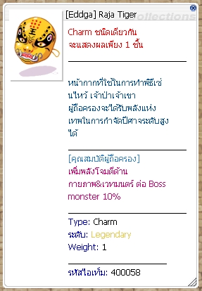- [Eddga] Raja Tiger คุณสมบัติ - เพิ่มพลังโจมตีด้านกายภาพ & เวทมนตร์ ต่อ Boss Monster 10%