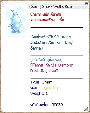 - [Garm] Snow Wolf's Roar คุณสมบัติ - มีโอกาสเกิด Skill Diamond Dust เมื่อถูกโจมตี